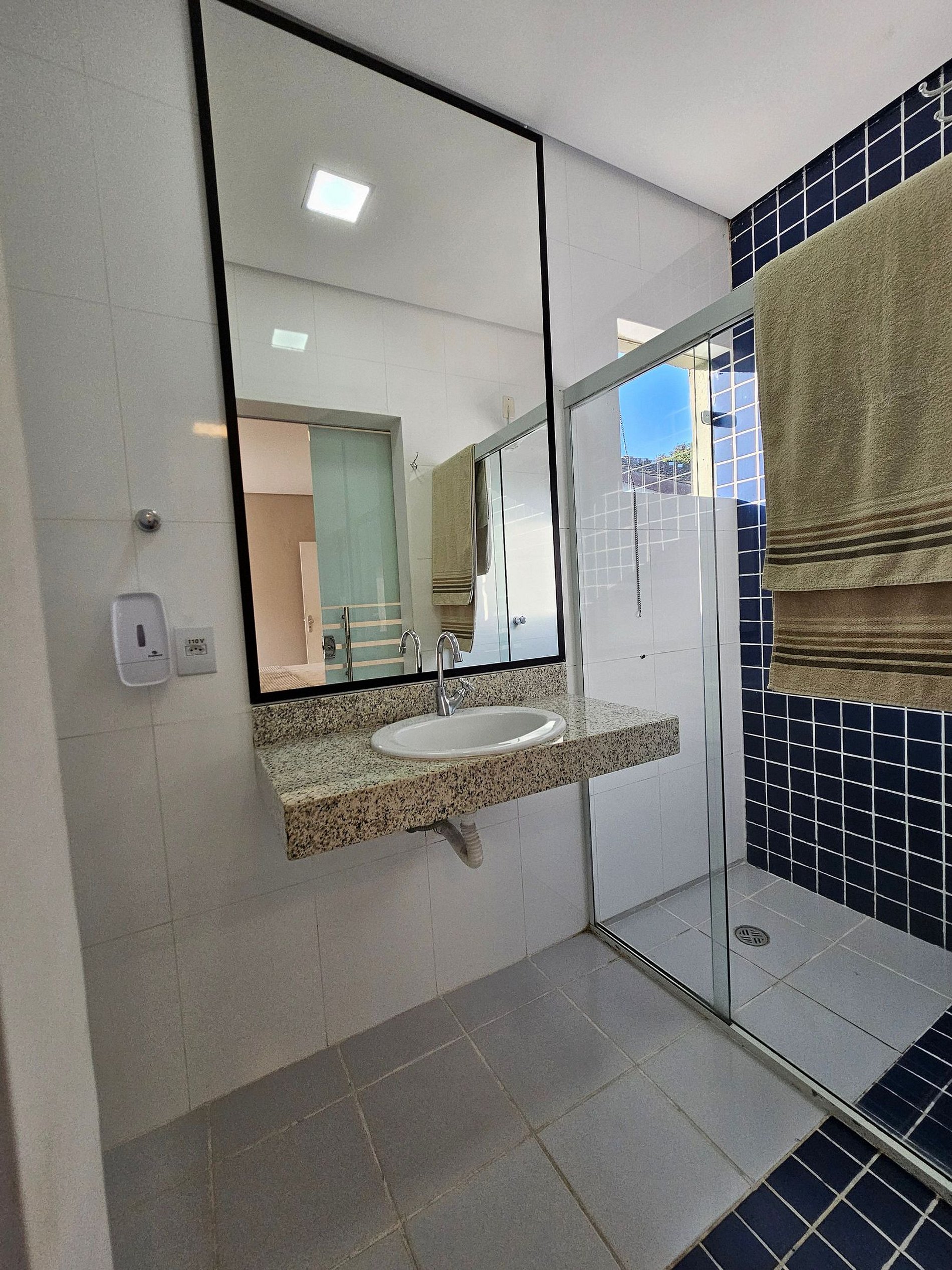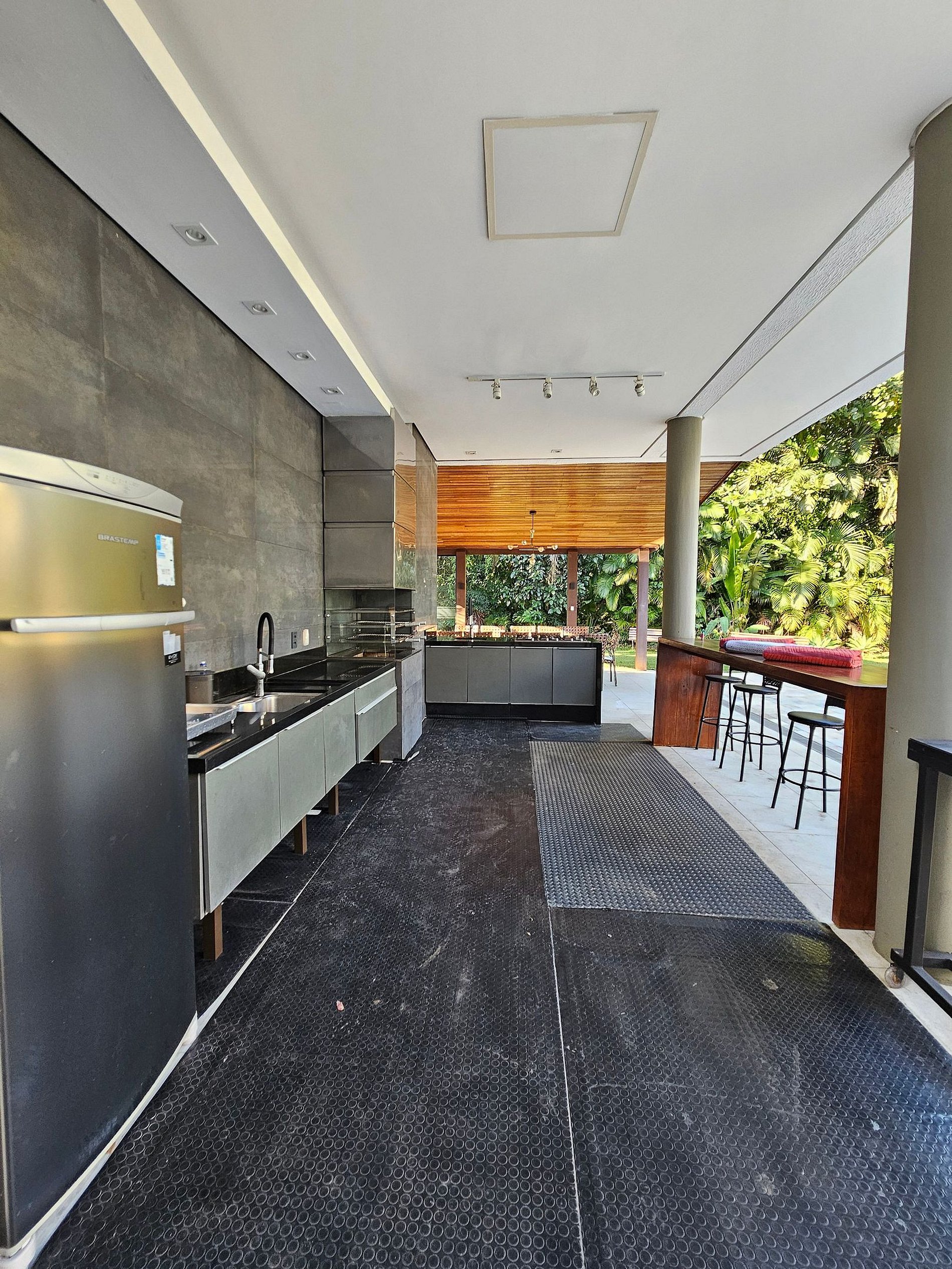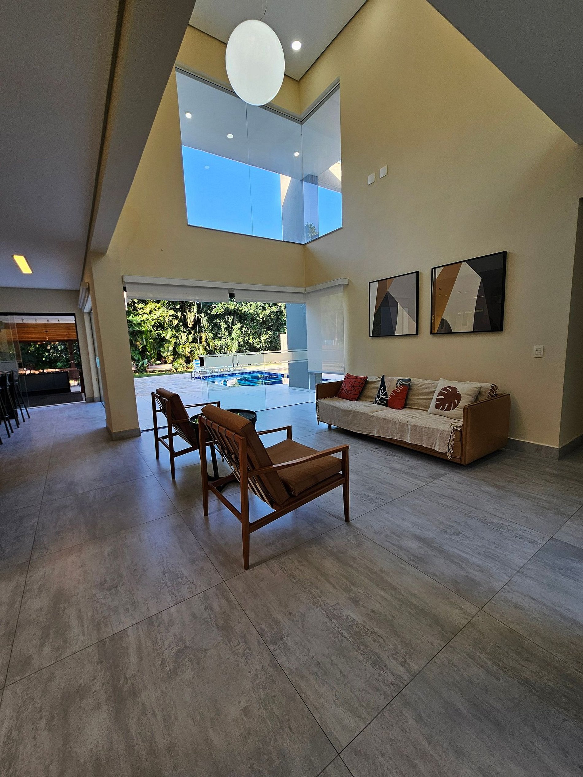 Os espaços integrados — sala, cozinha e área gourmet com churrasqueira — criam um ambiente acolhedor e funcional, perfeito para refeições e momentos em grupo. A piscina privativa com vista para uma área verde garante tranquilidade e um toque de natureza ao seu descanso.