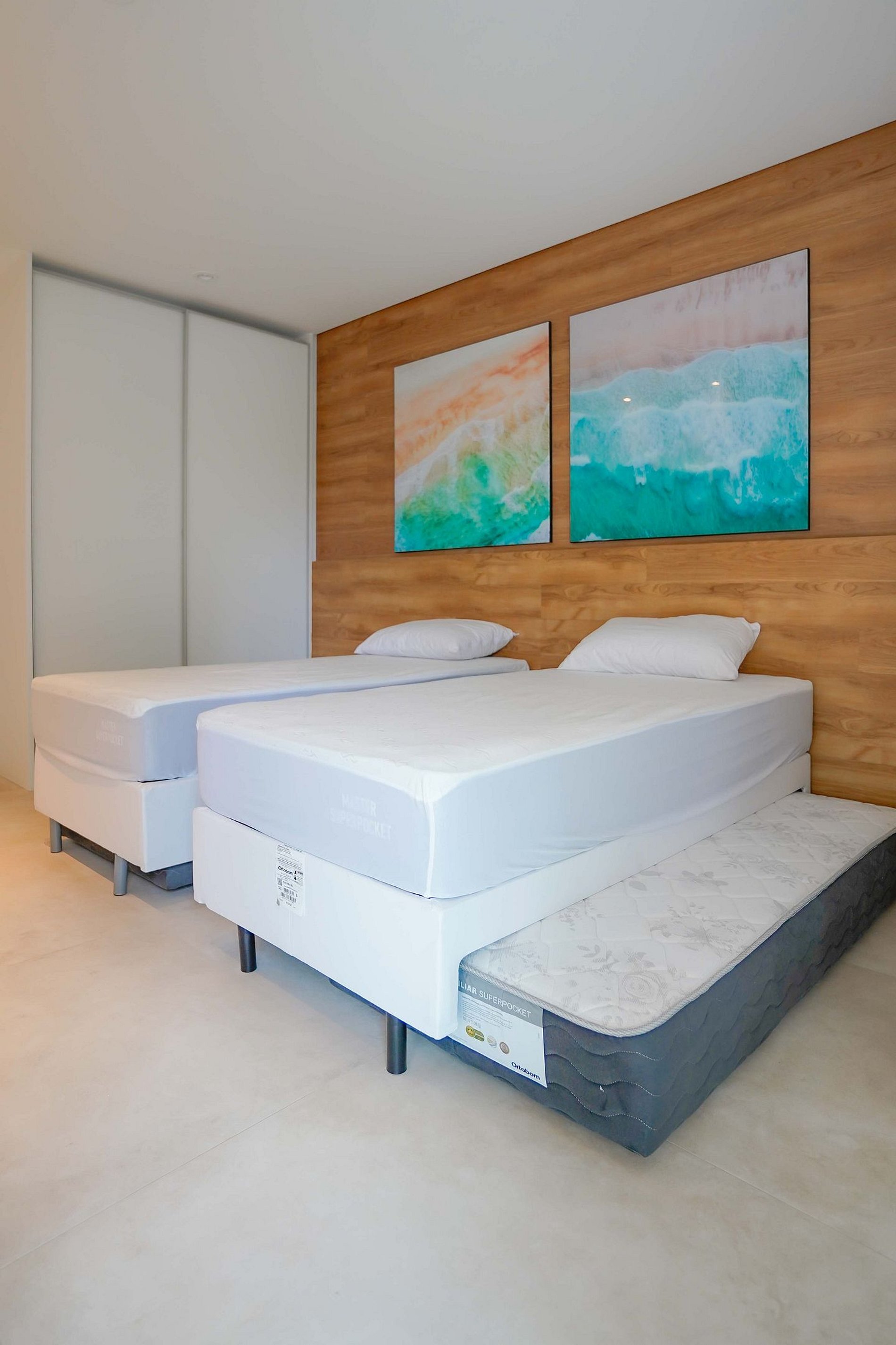 O apartamento possui 2 suítes. A suíte master é extremamente espaçosa e se destaca com sua cama king-size, enquanto a segunda suíte acomoda confortavelmente duas camas de solteiro com duas bicamas.