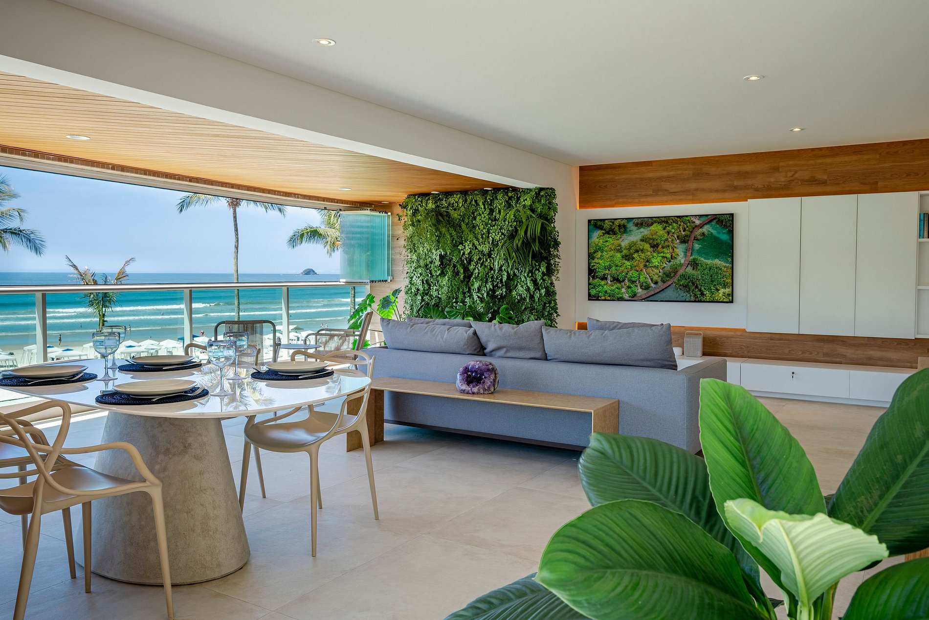 Com design modernista e soluções muito bem pensadas, esse apê integra o convívio social num único ambiente. A sala de estar e a cozinha gourmet flutuam sob a vista privilegiada para a praia, preenchida pela luz natural em abundância.