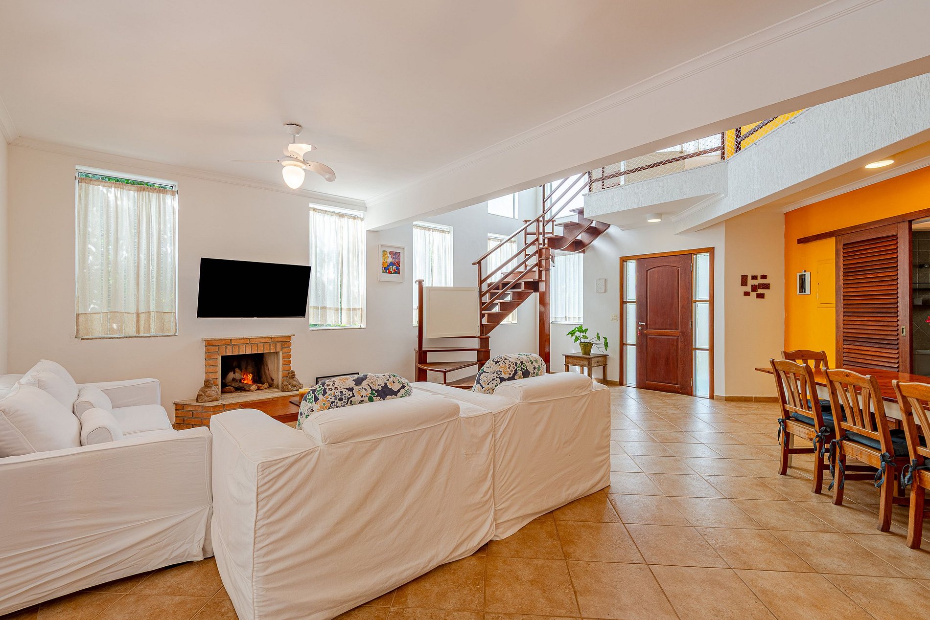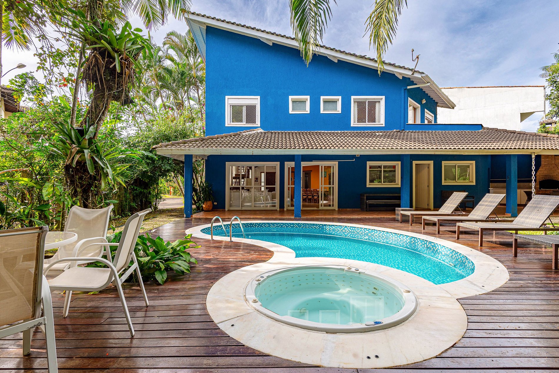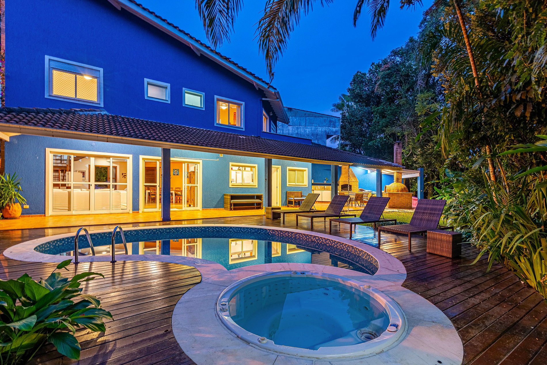 São 4 suítes com ar-condicionado (1 no térreo), Wi-Fi 500mb, Smart TV, piscina, Jacuzzi, churrasqueira, forno de pizza e lareira.